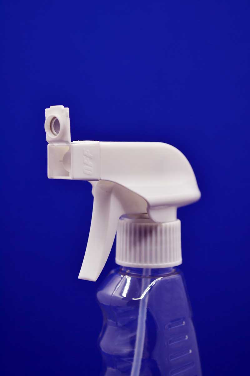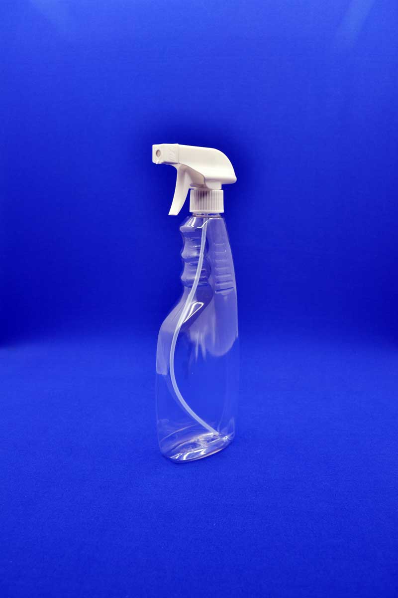 Пляшка ПЕТ 500 мл з курковим розпилювачем (тригером) з піноутворювачем та відкидною сіткою застосовується в побутовій хімії, зокрема, очищувач скла, очищувач іржі для кухні та ванни та інше.